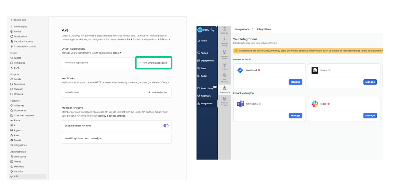 Connect OnSecurity with Linear to automatically sync pentest findings to your development workflow.